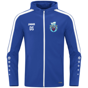 Kapuzenjacke in royalblau aus der Teamline JAKO Power bedruckt mit dem Vereinslogo auf der linken Brustseite und dem Vereinsnamen auf der Rückseite. Wahlweise mit Zusatz auf der Rückseite. Auf Wunsch mit Initialen auf der rechten Brustseite.